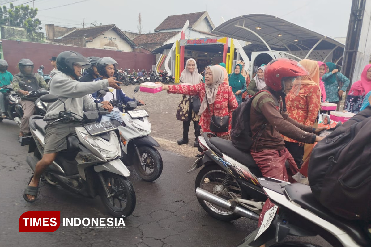 Pengurus dan anggota Dharma Wanita Persatuan Pemkab Madiun ikut serta dalam kegiatan bagi takjil bersama TP PKK Kabupaten Madiun. (Foto: Yupi Apridayani/TIMES Indonesia)